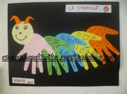 Tracer la main de l'enfant sur différentes feuilles de couleur. Découper les et coller de manière à réaliser une chenille. Laisser l'enfant décorer la chenille (feutres, gommettes...)