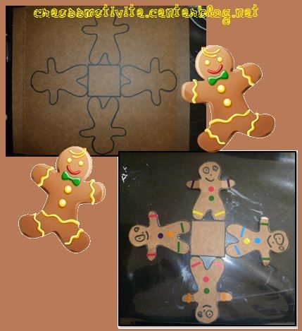Dessiner le gabarit du pot à crayon en forme de bonhomme de pain d'épice puis découper. Dessiner au feutre les yeux, le nez et la bouche. Ensuite décorer le bonhomme de pain d'épice avec des gommettes. Plier les 4 parties et les coller au niveau des bras avec de la colle. Enfin peindre un rouleau de papier WC et le coller entre les bonhommes de pain d'épice.
